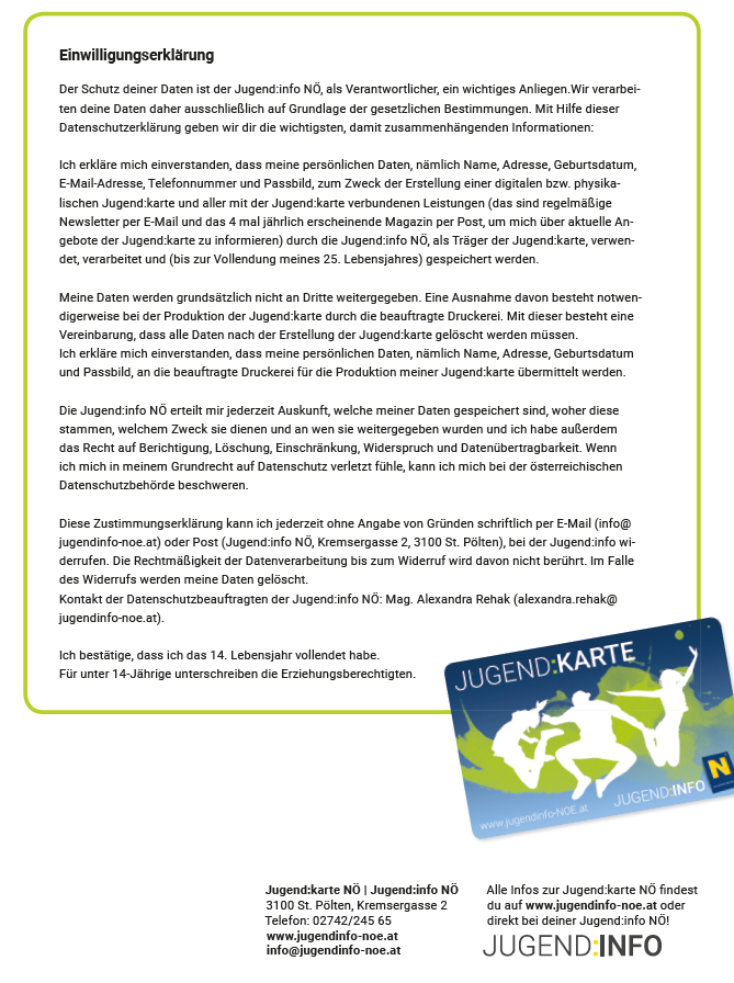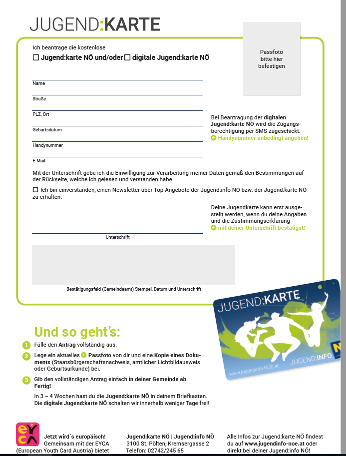 - Persönlicher Altersnachweis im Sinne des NÖ Jugendgesetzes
