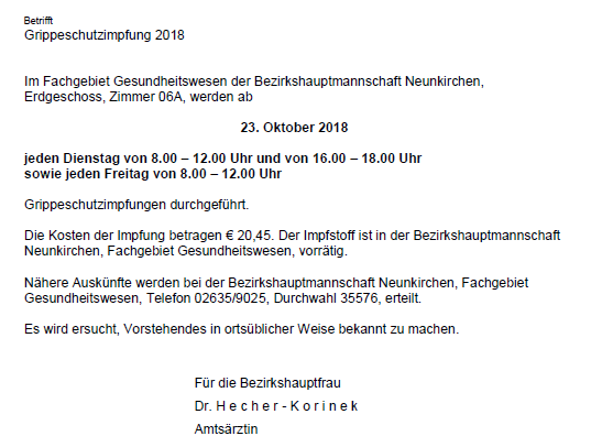 Nähere Auskünfte werden bei der Bezirkshauptmannschaft Neunkirchen, Fachgebiet Gesundheitswesen, Telefon 02635/9025, Durchwahl 35576, erteilt.