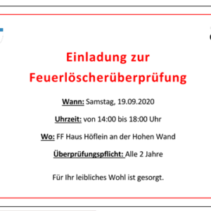 Jeder, der seinen Feuerlöscher überprüfen lassen will kann am 19. September zw. 14:00 und 18:00 Uhr zur FF Höflein (Quellenstraße, Oberhöflein) mit seinem Feuerlöscher kommen.
